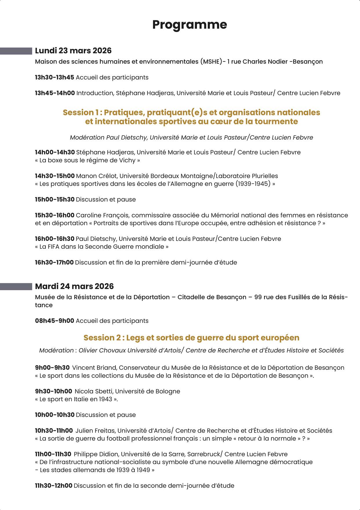 Ce colloque s’adresse aux chercheurs, étudiants, passionnés d’histoire et de sport, ainsi qu’à toutes les personnes intéressées par l’histoire sociale et culturelle de l’Europe contemporaine.
