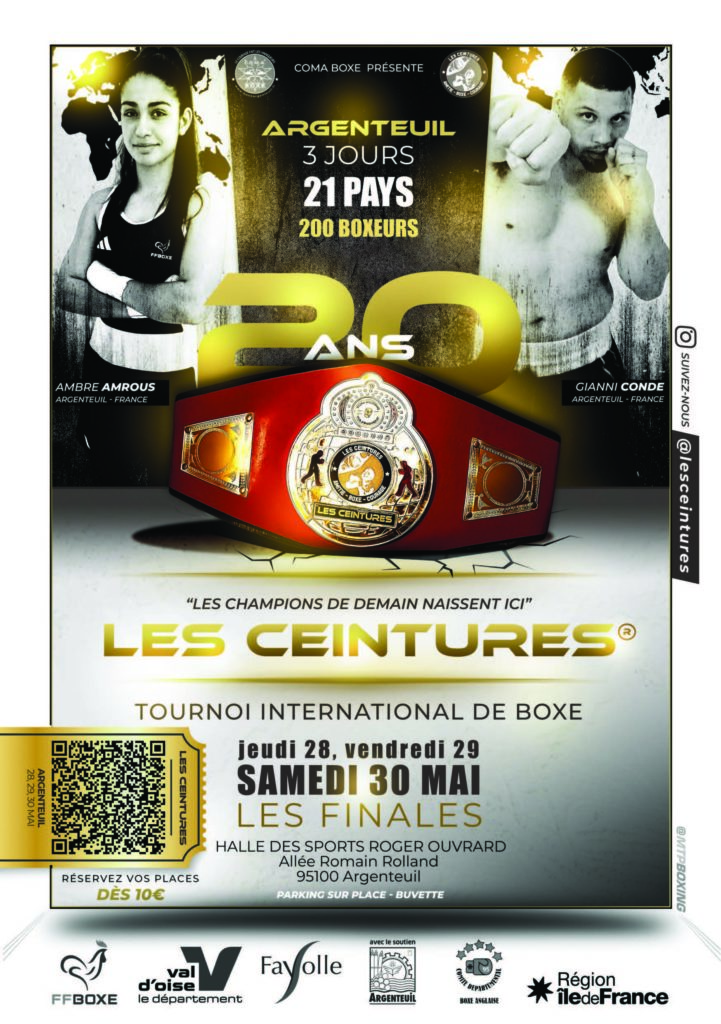 Le Club Olympique Multisports d’Argenteuil Boxe annonce le retour de son traditionnel tournoi international de boxe amateur « LES CEINTURES® » qui aura lieu les 28, 29 et 30 mai 2026 à Argentueil.