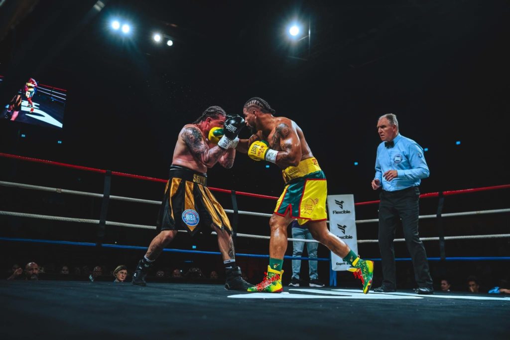Le Français dominait dans tous les domaines, réalisant de multiples combinaisons des deux mains tout en variant les zones de frappes. Jeison Troncoso semblait perdu, ne sachant pas comment s’y prendre devant ce boxeur qui lui en faisait voir de toutes les couleurs. Il montrait pourtant qu’il n’était pas là par hasard en touchant avec un uppercut droit. Une énième série de coups s’abattaient sur le Sud-Américain au sixième round mais il restait encore debout. Le Français passait la vitesse supérieure à la huitième reprise, il touchait lourdement et un crochet gauche en bas contraignait son challenger à poser un genou au sol pour être compté. L’excellent Jean-Robert Lainé surveillait ses réactions et il s’interposait fort à propos lors d’une nouvelle accélération du Français. « Il me tenait à cœur d’écouter les consignes », déclarait Leonardo Mosquea au micro d’Arnaud Romera qui commentait le combat sur la chaine Guyane la 1ère. « Je pense au championnat du monde, pas seulement pour le disputer mais pour le gagner ».